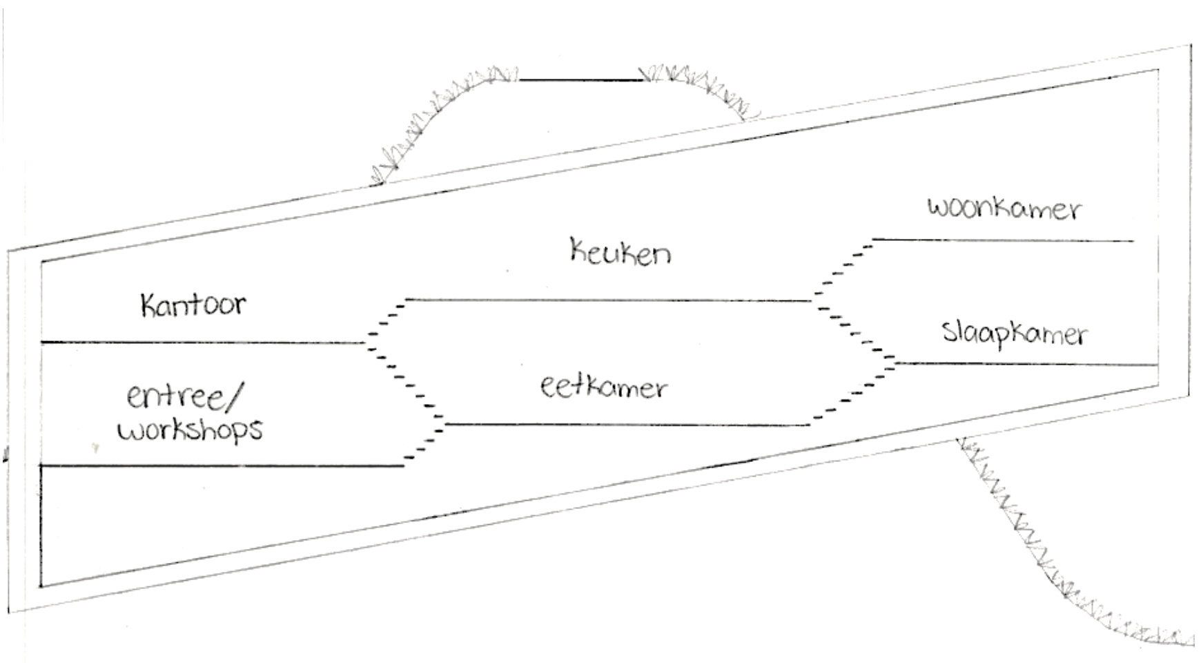 Voor de indeling heb ik een schetsmatige doorsnede gemaakt. Na verschillende opties te hebben uitgetekend, ben ik uitgekomen op de indeling die hiernaast is weergegeven. Ik heb gekozen om het concept van een split-level woning aan te houden, en telkens 2 verdiepingen te gebruiken. Doordat er geen dragende muren worden toegepast binnen de koker, ontstaat er een volledige doorkijk door de schoorsteen heen en creërt dit een open gevoel. De werkgerelateerde ruimtes, de workshop en het kantoor, zitten aan de voorkant, waar men ook binnen komt. De keuken en eetkamer bevinden zich in het hart van het huis. De woonkamer en slaapkamer beschikken over het mooie uitzicht over de Waal en Nijmegen.
